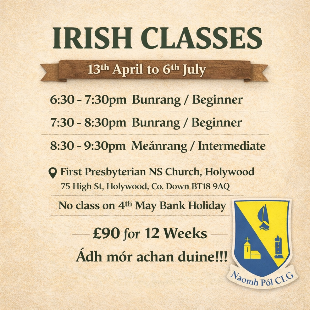 Ranganna Gaeilge ar fáil anois. We’re delighted to continue 2026 with our Irish classes. Due to popular demand we have secured the services of an experienced tutor for classes.